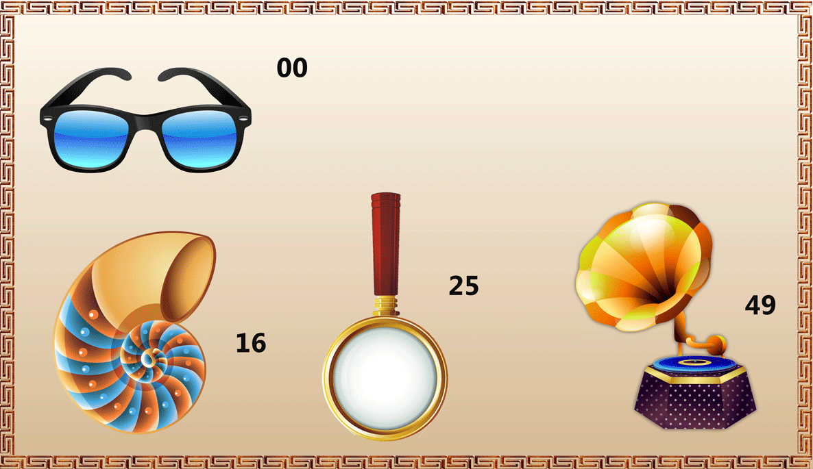16 – ракушка, 00 – очки, 25 – лупа, 49 – патефон.